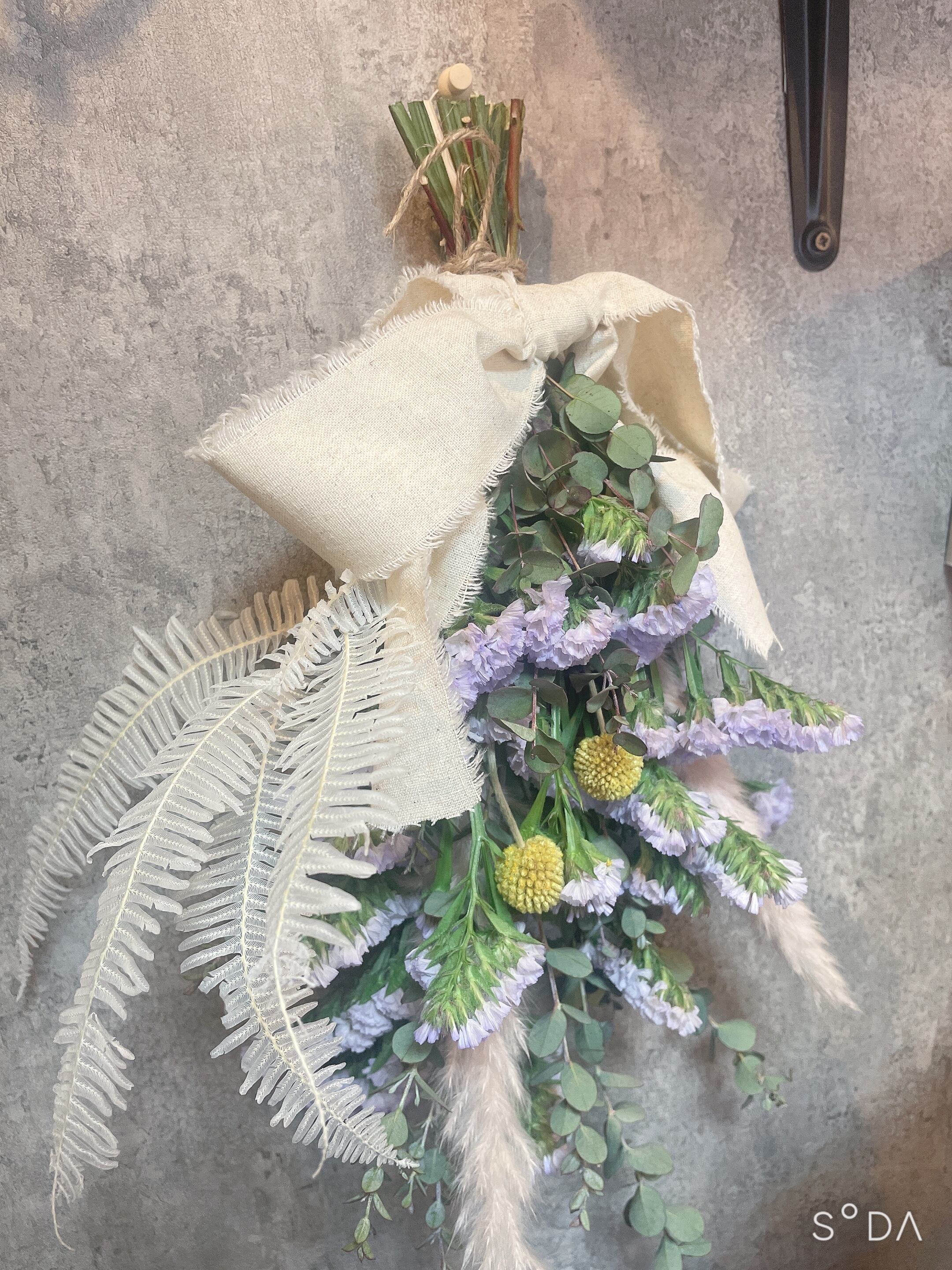 優しいパープルとホワイトでまとめた上品なドライフラワースワッグです。
